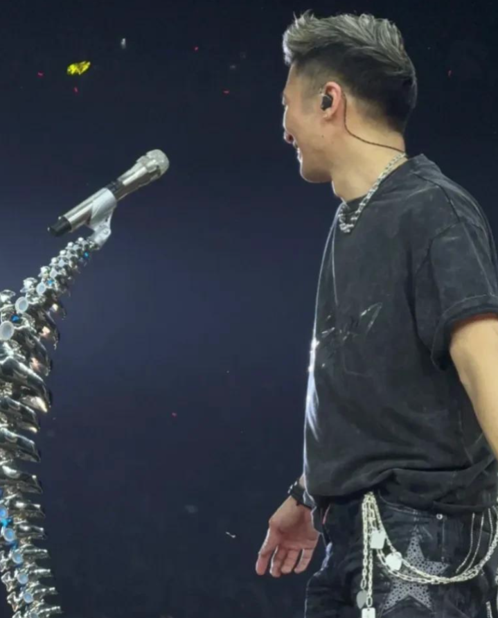 最绝的是人形话筒架——三个黑衣舞者跪地组成人体支架,他随手把话筒往"人肉托盘"上一搁,转身抄起电吉他就来段solo,这波操作帅得连后排举望远镜的大叔都吹起口哨。