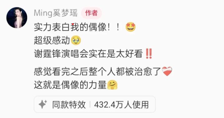 奚梦瑶也晒出演唱会现场照片,并表白偶像谢霆锋,表示超级感动,演唱会实在是太好看,看完之后整个人都被治愈了!