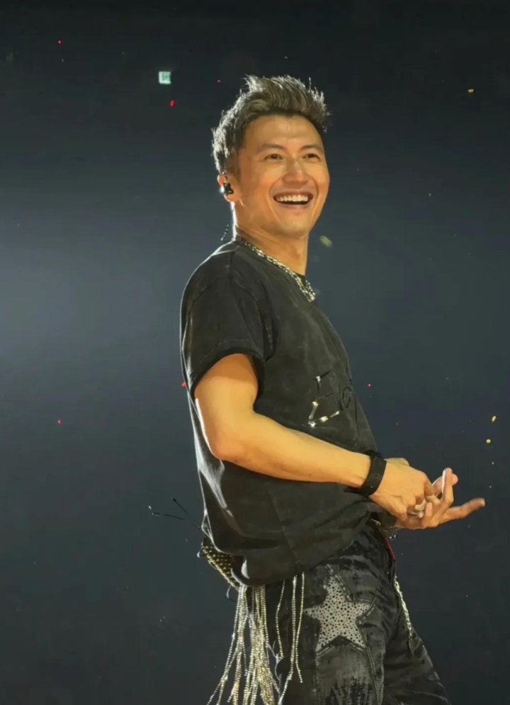 有粉丝发现他T恤后背全湿透了,牛仔裤膝盖处还蹭了块灰,估计是刚才跪地飙高音时蹭的——这哪是天王巨星?分明是隔壁玩乐队玩嗨了的大学生。