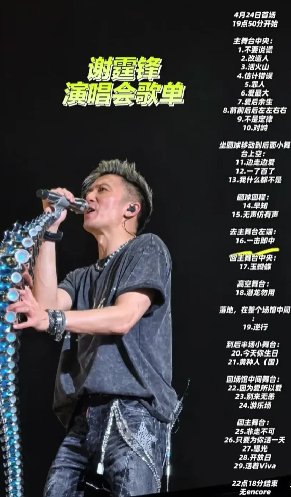 可谢霆锋偏不,整场演出就靠二十八把吉他、六个话筒架和二十九首歌硬刚,连口水都不带多喝一口的。台下坐着半个香港娱乐圈的大咖,台上这位"厨子歌手"却素着脸就来了,这哪是开演唱会?分明是把娱乐圈的浮华滤镜摔得稀碎。